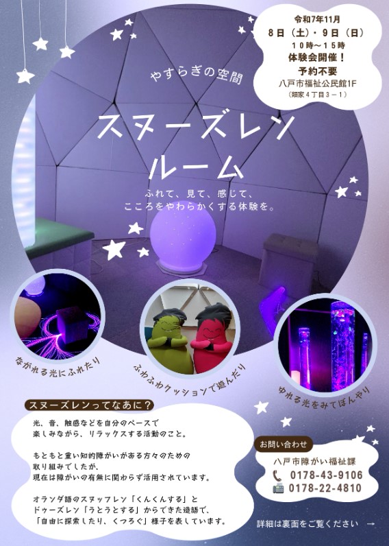 「スヌーズレン体験会」日時:令和7年11月8日(土曜日)・11月9日(日曜日) 10時~15時会場:八戸市福祉公民館1階 (類家四丁目3-1)体験会は予約不要で、ご自由にスヌーズレンを体験し…